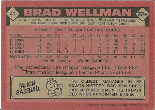 The player: Wellman was a career utility infielder whose sister married pitcher Tom Candiotti. Drafted by the Royals, he was part of a blockbuster trade when he was traded to the Giants with Atlee Hammaker, Renie Martin, and former first round pick Craig Chamberlain for pitching great Vida Blue. His "best" season was probably 1984 when he had a career high 25 RBIs, and 10 stolen bases. He once won $1,000 on a clubhouse dare to shave his head (ooh, what a rebel!).